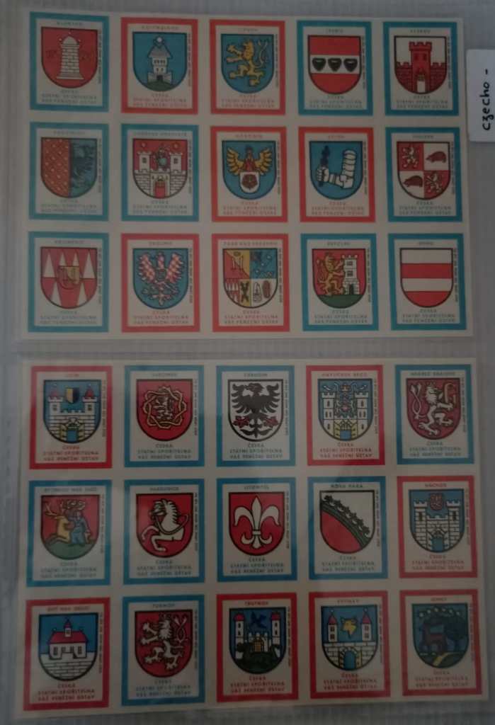 - These labels depict coats of arms from cities and regions in former Czechoslovakia.