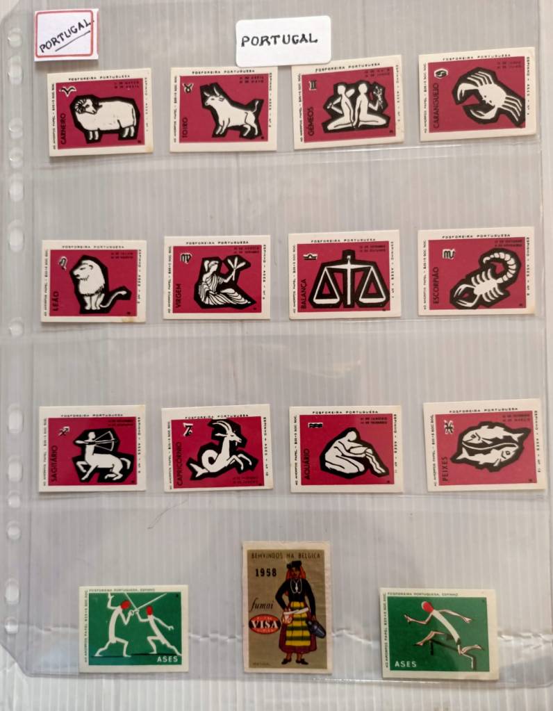 - Labels depicting zodiac signs (e.g., Leo, Gemini), possibly from Portugal.