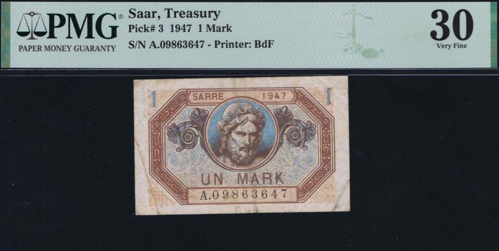 A 1 Mark note from the Saar region, issued in 1947, as certified by PMG (Paper Money Guaranty). The following details are evident: