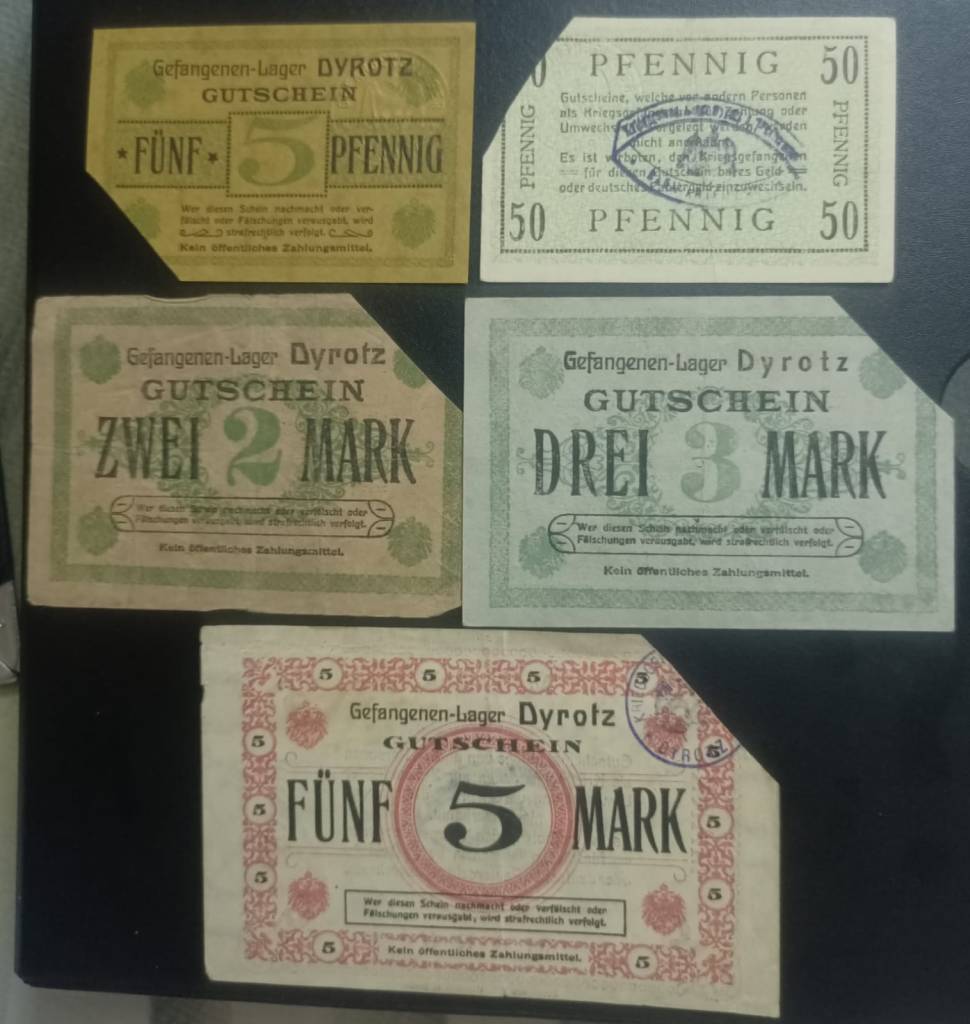 Dyrotz was a POW camp, likely in Germany, where these notes were used internally for transactions among prisoners.