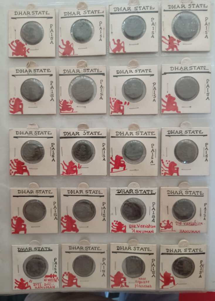 - The coins are labeled “DHAR STATE PAISA”, indicating their denomination and origin.