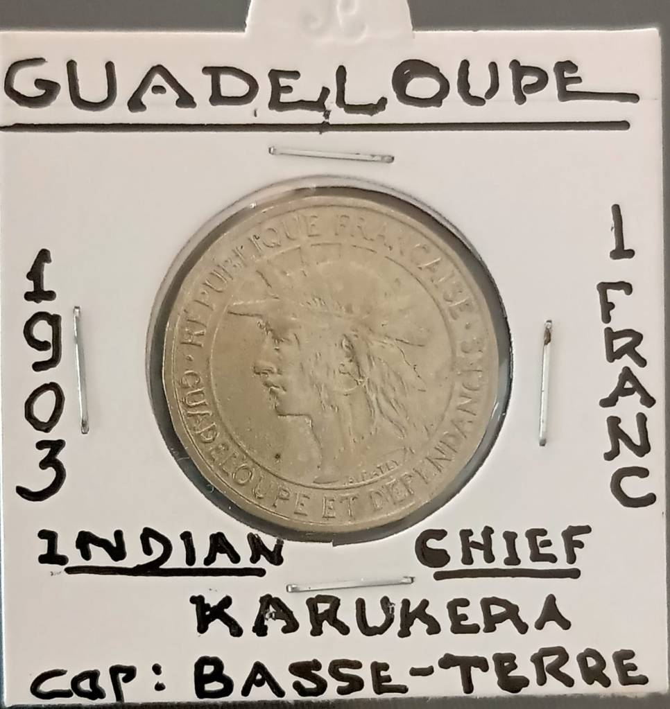 Design: Depicts the “Indian Chief” allegorical figure, Karukera being the indigenous name of Guadeloupe.