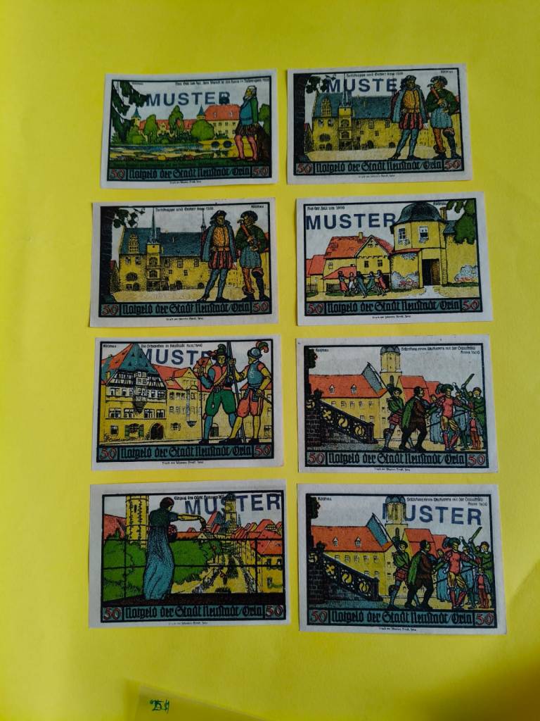 This vibrant 50 Pfennig Notgeld set bears the bold word “MUSTER” — German for “sample” or “specimen.” That means these weren’t for everyday market strolls or sausage purchases… nope, these were the VIP test prints used for approvals, presentations, or printers’ archives.