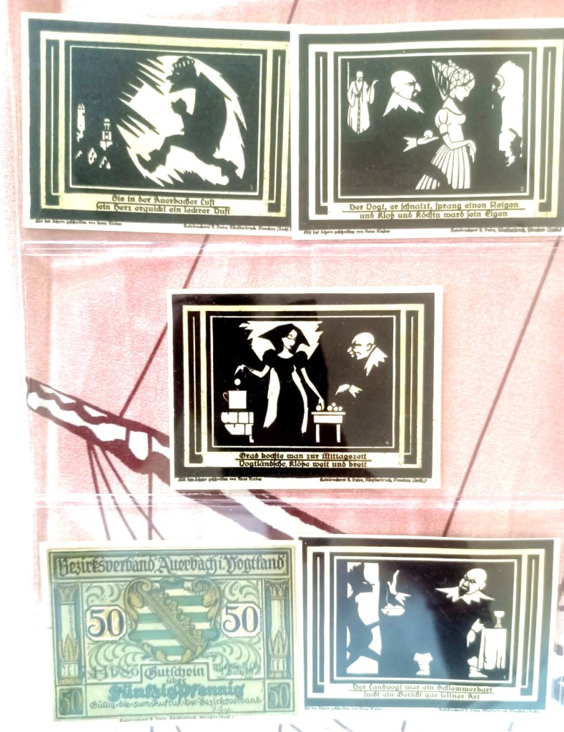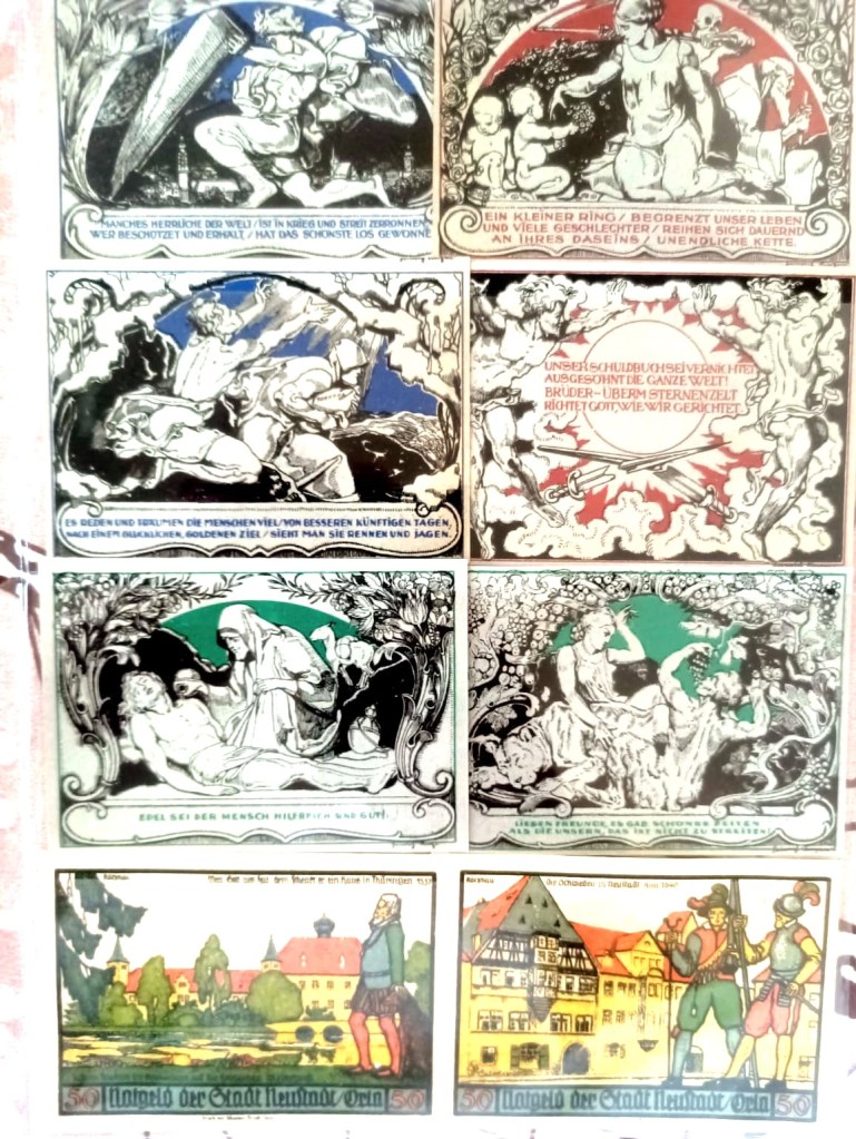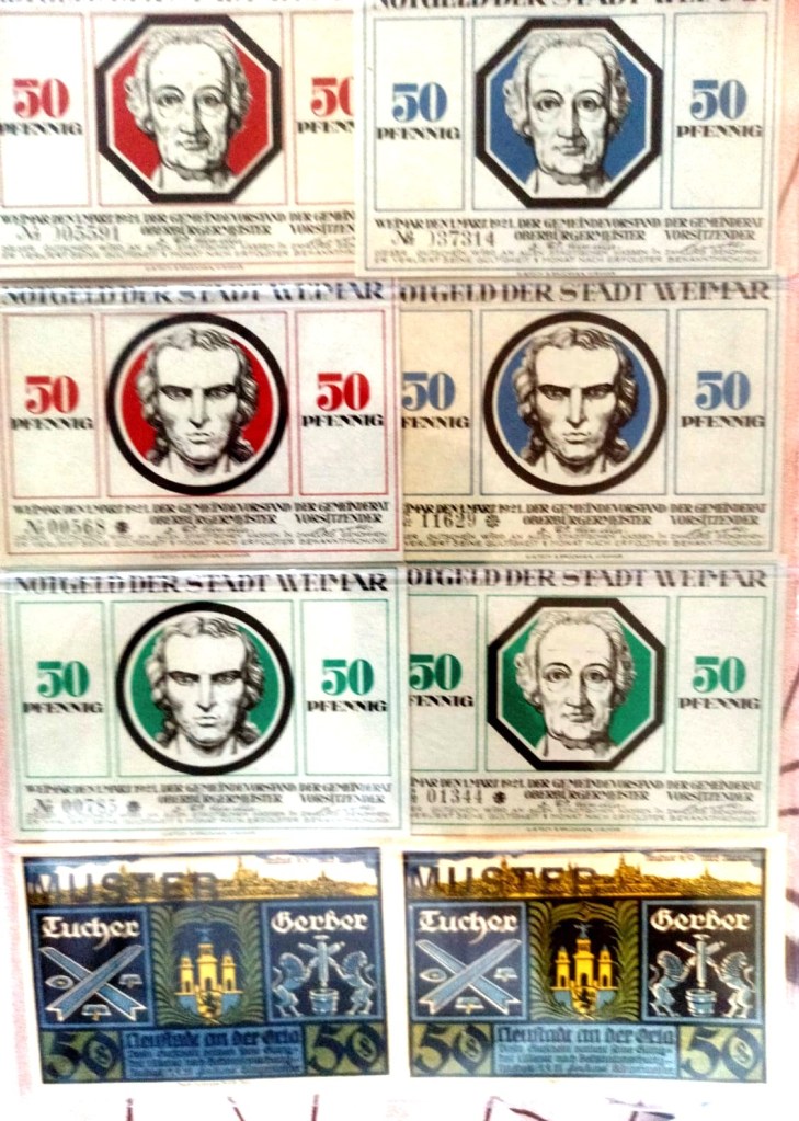 - Each note is stamped and serialized, and marked “Notgeld der Stadt Weimar” (Emergency Money of the City of Weimar).