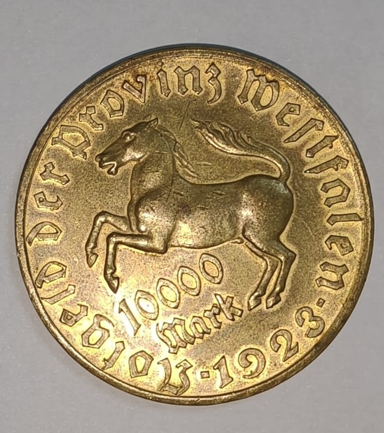 “From a time when a loaf of bread cost millions — this 10k marks 1923 Westphalia Notgeld coin wasn’t about spending, but surviving. The galloping horse symbolized courage through economic chaos.”